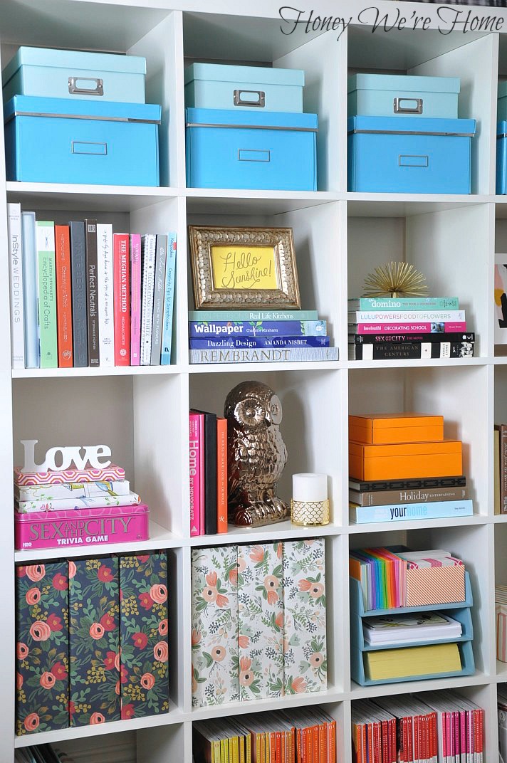 While the contents of the bookshelf were generally very colorful, it used to be dominated by aqua. Now, I'm going for more pinks, blushes and golds in the bookshelf. Not wanting to purchase more magazine files, I opted to cover my existing aqua ones in wrapping paper.